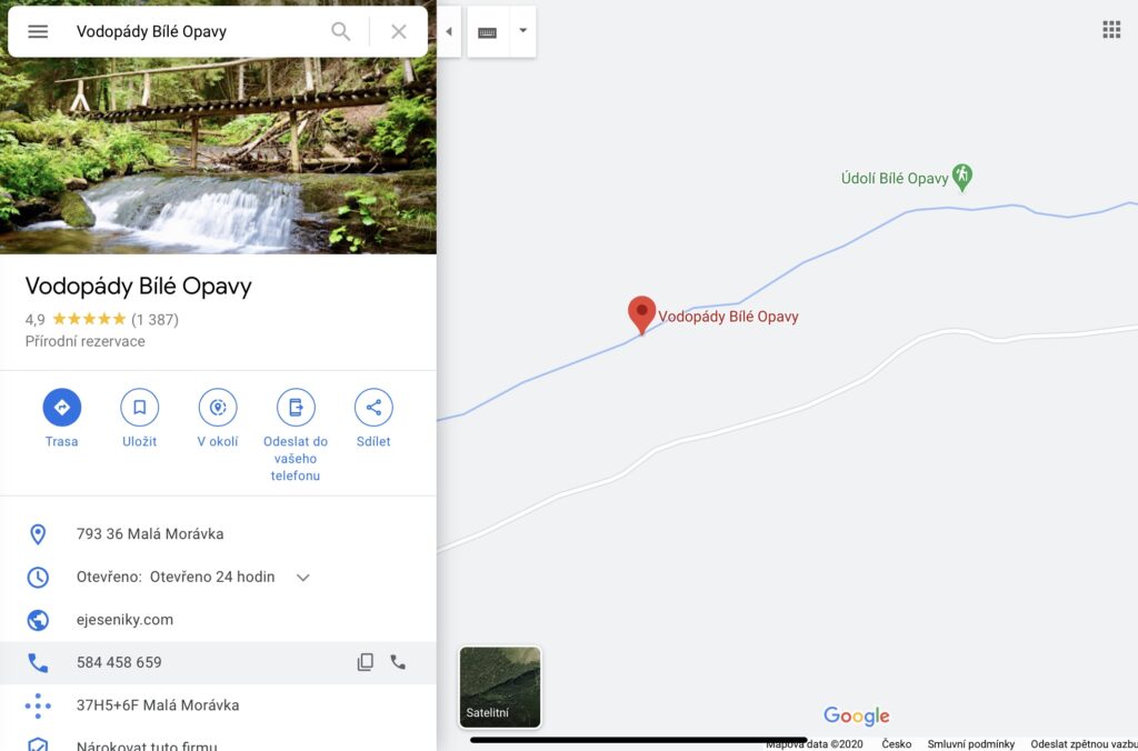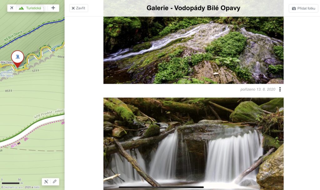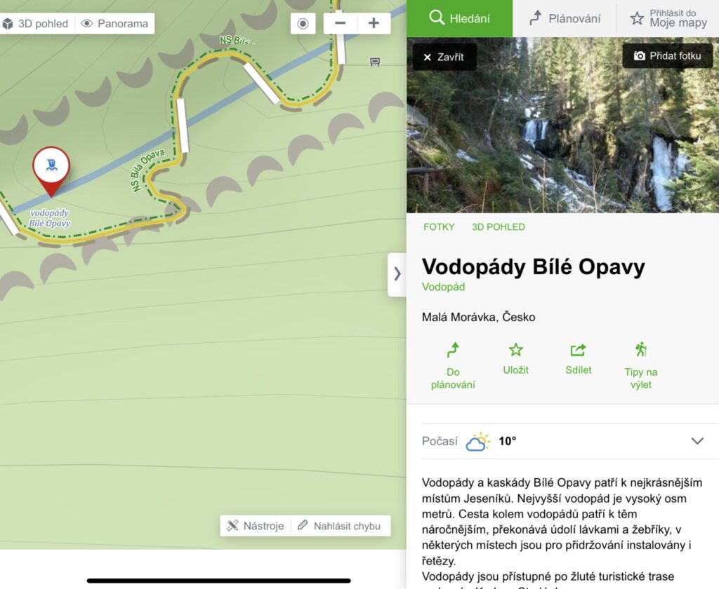A great advantage of mapy.cz is that if you click on the waterfall marker on the map, you will see more detailed information, including photos, on the right side of the screen.