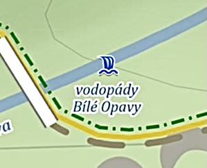 It is necessary to change the scale and zoom in on the map. With a zoom large enough, detailed information about tourist destinations, including waterfalls, will start to appear on the screen. Waterfalls have their own mark on the maps, which, in the case of mapy.cz, is depicted in following way.